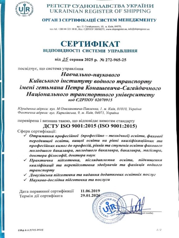 Сертифікація проведена Українським Регістром судноплавства – органом з сертифікації систем менеджменту, акредитованим на міжнародному рівні.