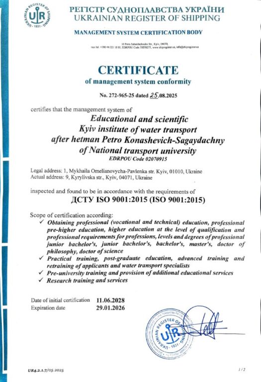 Навчально-науковий Київський інститут водного транспорту імені гетьмана Петра Конашевича-Сагайдачного НТУ продовжує розвивати стратегічні партнерства та підтверджувати високі стандарти освітньої діяльності.